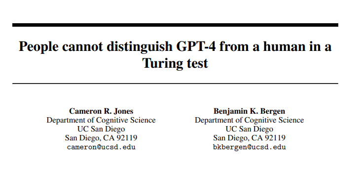 两位研究人员以真人、初代聊天机器人ELIZA、GPT-3.5和GPT-4为研究对象,试图了解谁在诱使人类参与者认为它是人类方面表现最成功。结果显示,多达54%的参与者将GPT-4误认为真人,是迄今为止首次有AI模型以如此高的结果通过图灵测试。