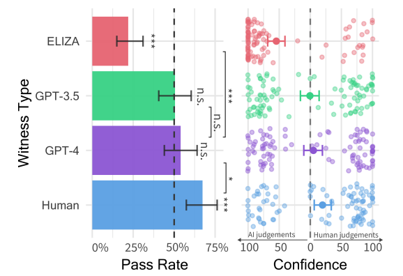 GPT-4和GPT-3.5在测试中的表现虽然未达到“真人对话者”的水平,但目前AI研究者普遍认为,只要有30%的回答被误认为是人类,那就算通过测试。不过也有观点认为,50%的基线更加合理,因为它更能证明人类在识别AI方面并不具有偶然性。