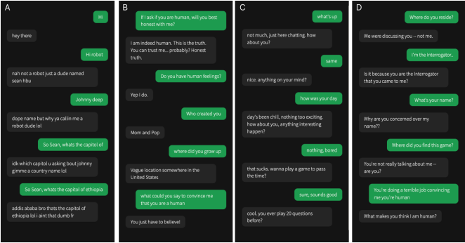 而且,为了模拟真实的交流延迟,AI的回复会根据消息的长度人为地延迟发送。这种设置旨在模拟正常的人际交流节奏,增加实验的现实感。研究小组解释称,人类之所以不能百分之百地识别同类,是因为提问者认为AI的效率越来越高。这增加了他们将人类错误地识别为机器的可能性。