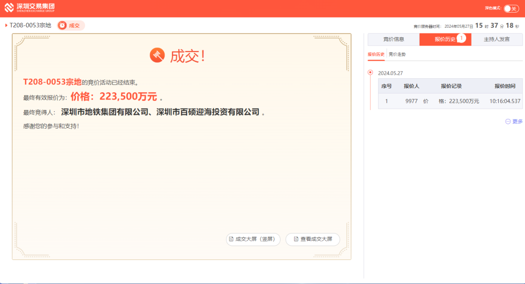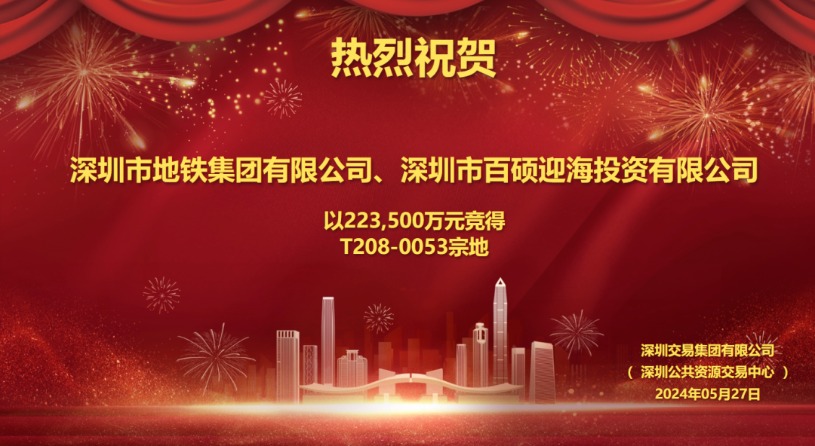 据深圳公共资源交易中心5月27日公告显示,万科转让的深圳湾超级总部基地T208-0053宗地使用权由深圳市地铁集团有限公司和深圳市百硕迎海投资有限公司以挂牌价22.35亿元联合竞得。